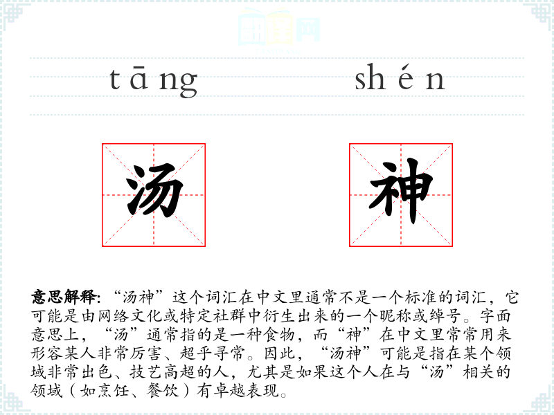 “汤神”这个词汇在中文里通常不是一个标准的词汇,它可能是由网络文化或特定社群中衍生出来的一个昵称或绰号。字面意思上,“汤”通常指的是一种食物,而“神”在中文里常常用来形容某人非常厉害、超乎寻常。因此,“汤神”可能是指在某个领域非常出色、技艺高超的人,尤其是如果这个人在与“汤”相关的领域(如烹饪、餐饮)有卓越表现。