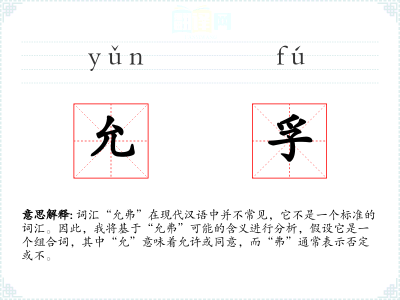 词汇“允弗”在现代汉语中并不常见,它不是一个标准的词汇。因此,我将基于“允弗”可能的含义进行分析,假设它是一个组合词,其中“允”意味着允许或同意,而“弗”通常表示否定或不。