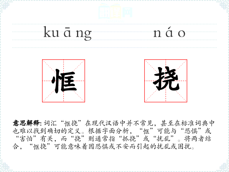 词汇“恇挠”在现代汉语中并不常见,甚至在标准词典中也难以找到确切的定义。根据字面分析,“恇”可能与“恐惧”或“害怕”有关,而“挠”则通常指“抓挠”或“扰乱”。将两者结合,“恇挠”可能意味着因恐惧或不安而引起的扰乱或困扰。