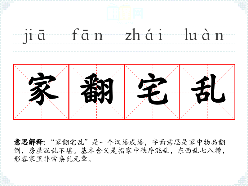 “家翻宅乱”是一个汉语成语,字面意思是家中物品翻倒,房屋混乱不堪。基本含义是指家中秩序混乱,东西乱七八糟,形容家里非常杂乱无章。