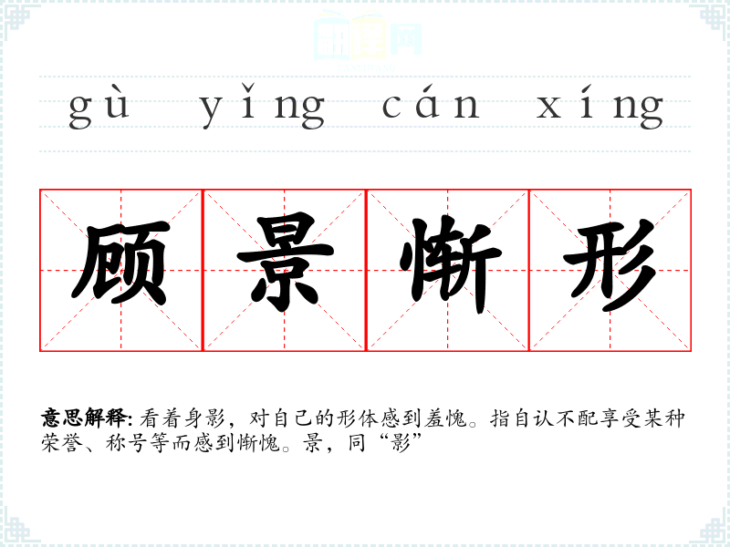 看着身影,对自己的形体感到羞愧。指自认不配享受某种荣誉、称号等而感到惭愧。景,同“影”