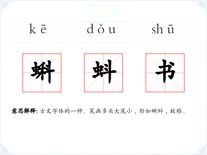 古文字体的一种。笔画多头大尾小﹐形如蝌蚪﹐故称。
