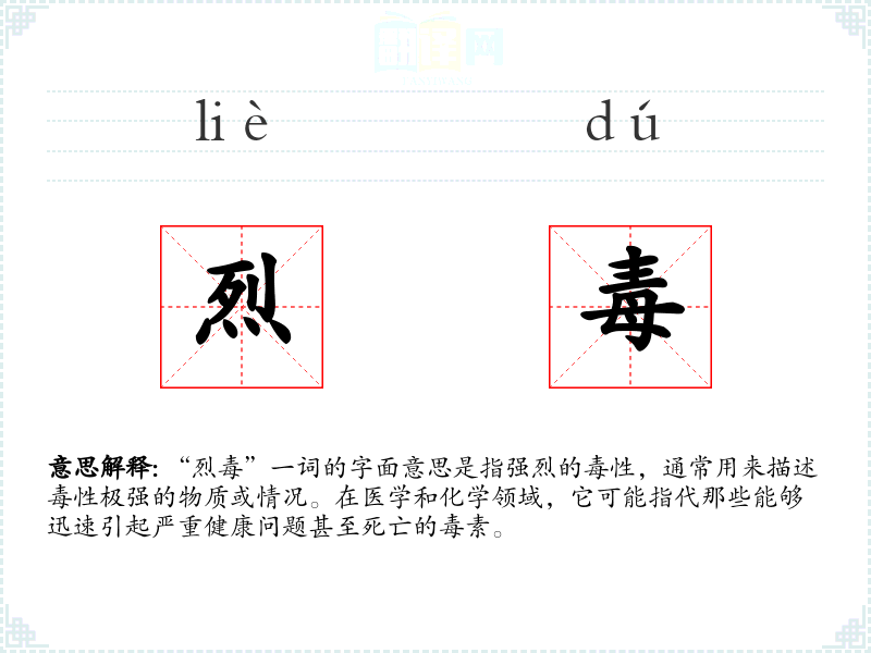 “烈毒”一词的字面意思是指强烈的毒性,通常用来描述毒性极强的物质或情况。在医学和化学领域,它可能指代那些能够迅速引起严重健康问题甚至死亡的毒素。