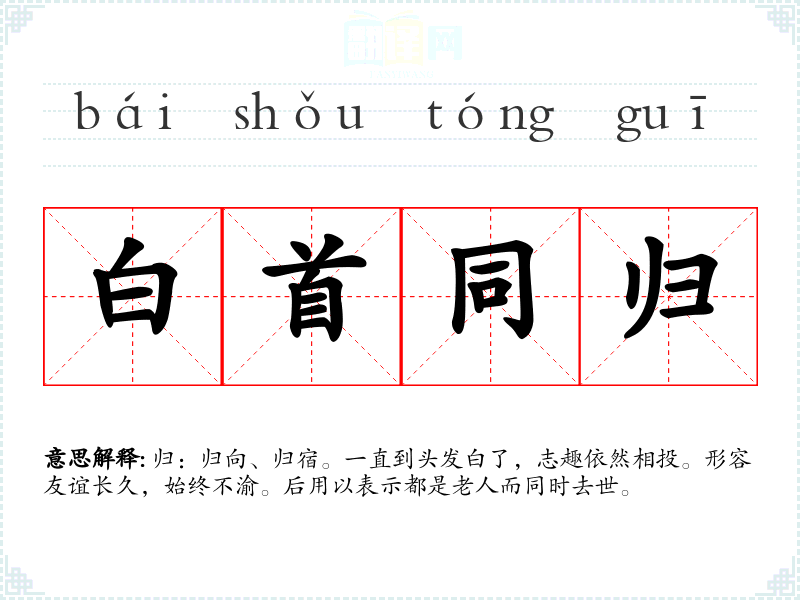 归:归向、归宿。一直到头发白了,志趣依然相投。形容友谊长久,始终不渝。后用以表示都是老人而同时去世。