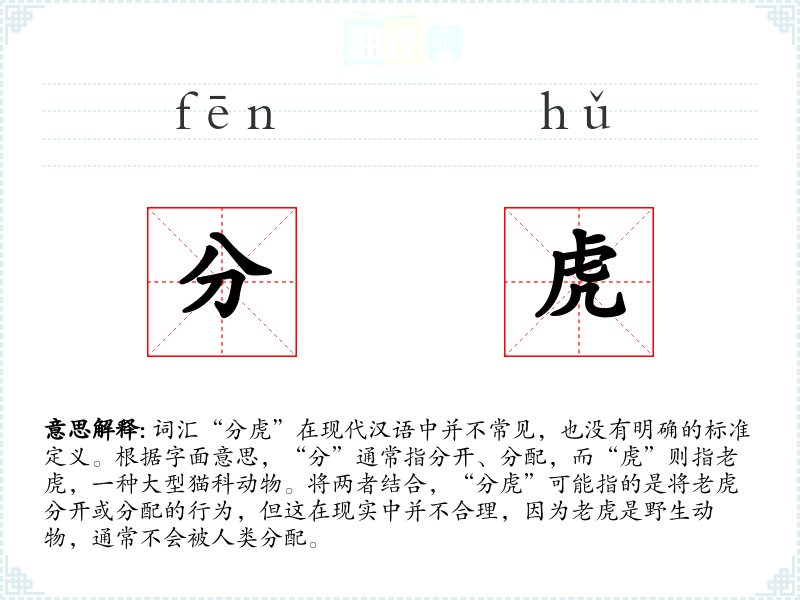 由于“分虎”不是一个标准的词汇,我们无法给出一个确切的基本定义。它可能是一个生造词,或者在特定的方言、俚语中有所使用,但在标准汉语中并不常见。