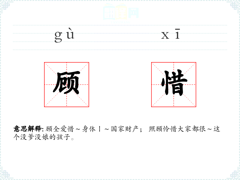 顾全爱惜~身体丨~国家财产; 照顾怜惜大家都很~这个没爹没娘的孩子。