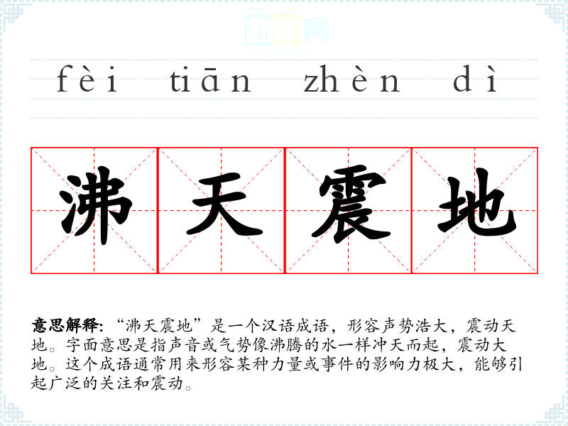 “沸天震地”这个成语的词源较为明确,由“沸天”和“震地”两个词组合而成。在古代汉语中,“沸”指的是水沸腾,“震”指的是震动。这个成语的形成反映了古人对于自然现象的观察和描述,后来逐渐被用来形容各种具有巨大影响力的**。