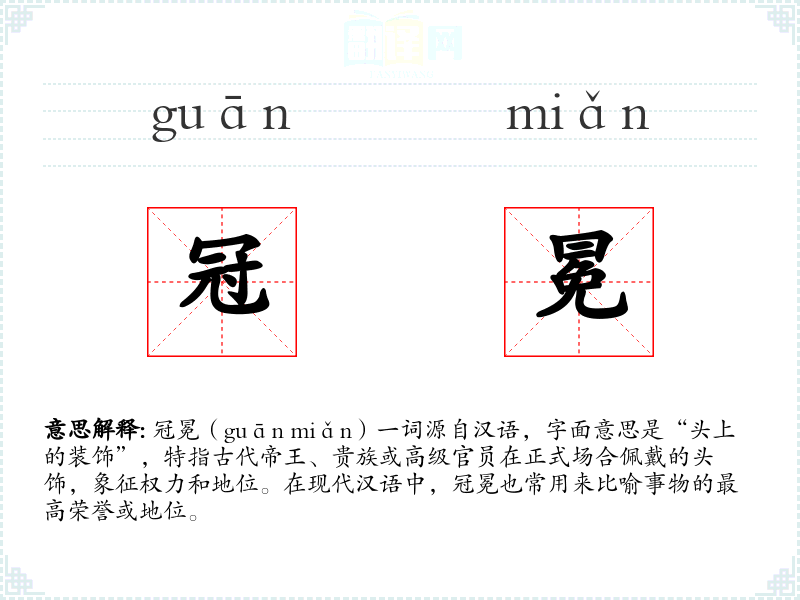 冠冕(guān miǎn)一词源自汉语,字面意思是“头上的装饰”,特指古代帝王、贵族或高级官员在正式场合佩戴的头饰,象征权力和地位。在现代汉语中,冠冕也常用来比喻事物的最高荣誉或地位。