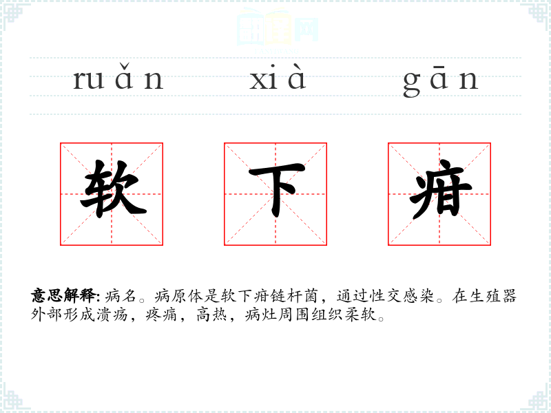 病名。病原体是软下疳链杆菌,通过性交感染。在生殖器外部形成溃疡,疼痛,高热,病灶周围组织柔软。