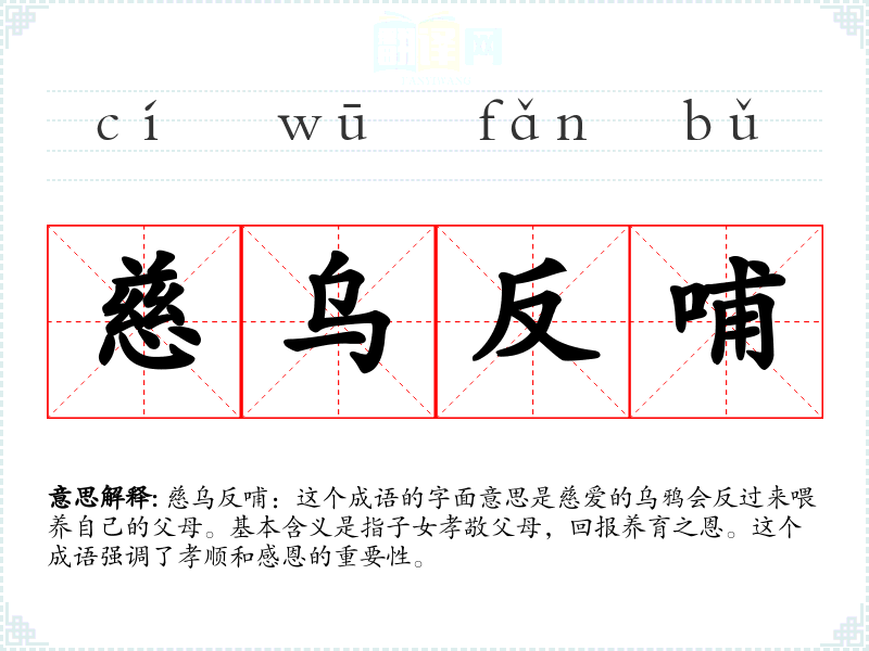 慈乌反哺:这个成语的字面意思是慈爱的乌鸦会反过来喂养自己的父母。基本含义是指子女孝敬父母,回报养育之恩。这个成语强调了孝顺和感恩的重要性。