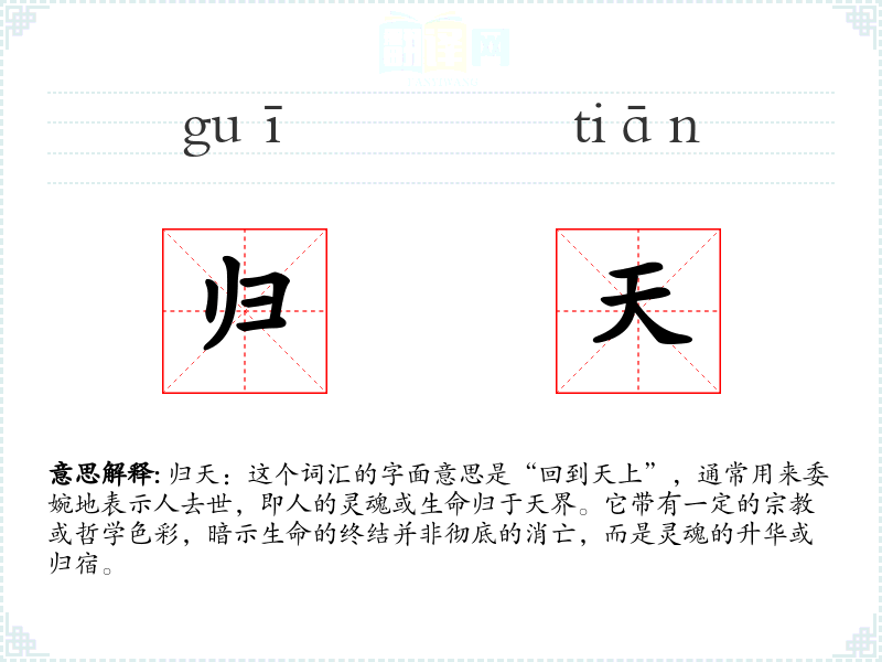 归天:这个词汇的字面意思是“回到天上”,通常用来委婉地表示人去世,即人的灵魂或生命归于天界。它带有一定的**或哲学色彩,暗示生命的终结并非彻底的消亡,而是灵魂的升华或归宿。