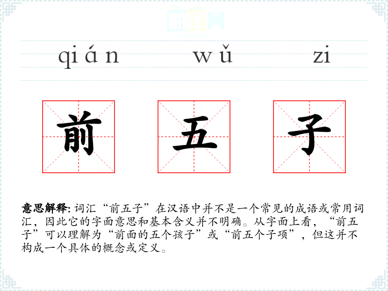 在情感与联想方面,由于“前五子”不是一个常用词汇,它不会引起特定的情感反应或联想。