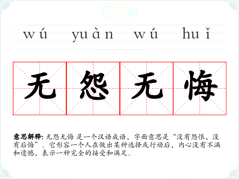 无怨无悔 是一个汉语成语,字面意思是“没有怨恨,没有后悔”。它形容一个人在做出某种选择或行动后,内心没有不满和遗憾,表示一种完全的接受和满足。