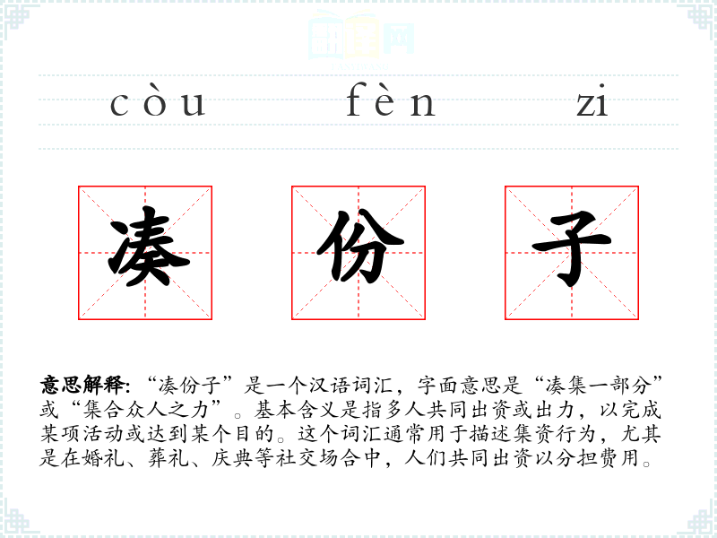 “凑份子”是一个汉语词汇,字面意思是“凑集一部分”或“集合众人之力”。基本含义是指多人共同出资或出力,以完成某项活动或达到某个目的。这个词汇通常用于描述集资行为,尤其是在婚礼、葬礼、庆典等社交场合中,人们共同出资以分担费用。