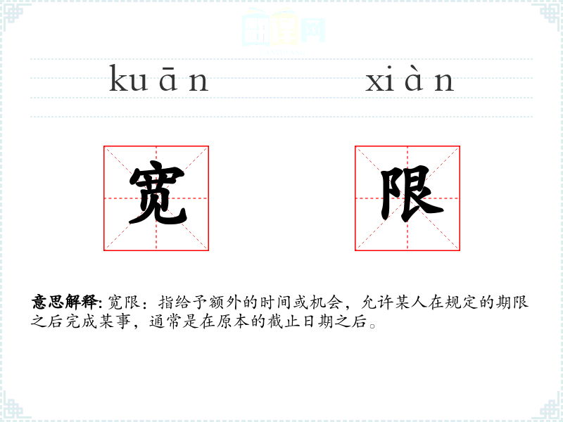 宽限:指给予额外的时间或机会,允许某人在规定的期限之后完成某事,通常是在原本的截止日期之后。