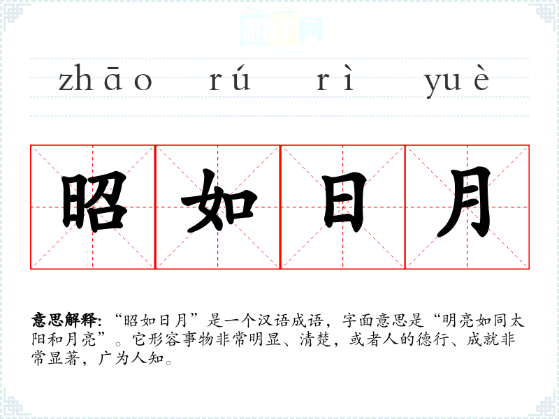 - 文学语境:在文学作品中,这个成语常用来形容英雄人物的伟大事迹或高尚品德,如“他的功绩昭如日月,永载史册。”