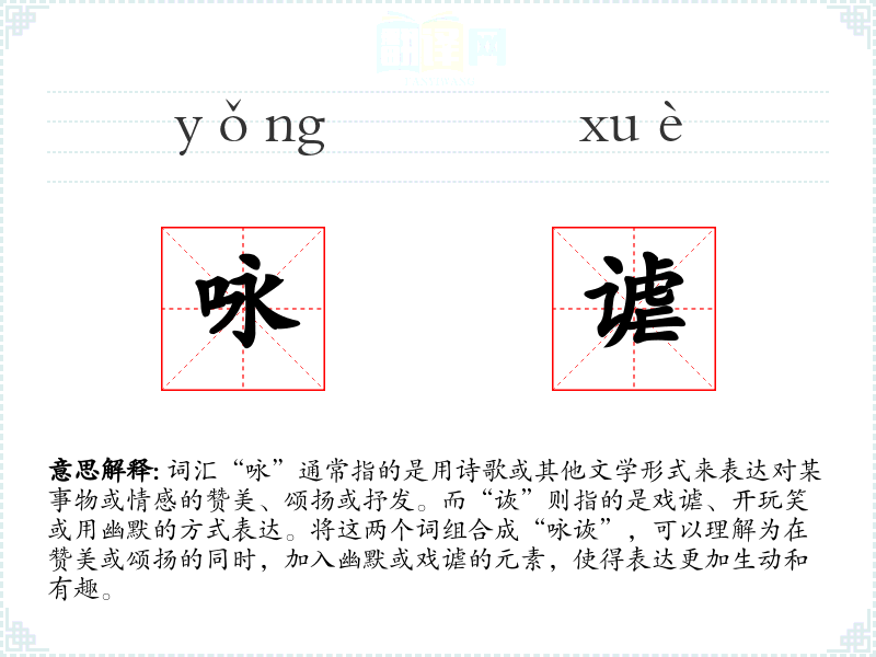 - 词源:“咏”源自古代的诗歌创作,而“诙”则源自古代的幽默表达。