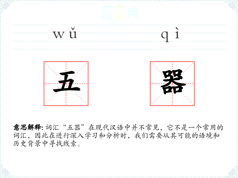 词汇“五器”在现代汉语中并不常见,它不是一个常用的词汇,因此在进行深入学*和分析时,我们需要从其可能的语境和历史背景中寻找线索。
