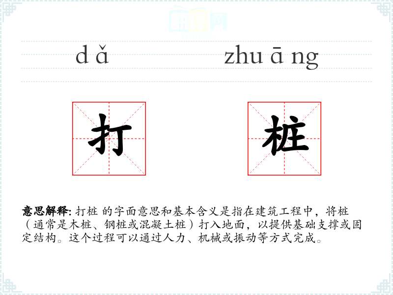 打桩 的字面意思和基本含义是指在建筑工程中,将桩(通常是木桩、钢桩或混凝土桩)打入地面,以提供基础支撑或固定结构。这个过程可以通过人力、机械或振动等方式完成。