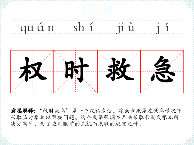 “权时救急”是一个汉语成语,字面意思是在紧急情况下采取临时措施以解决问题。这个成语强调在无法采取长期或根本解决方案时,为了应对眼前的危机而采取的权宜之计。