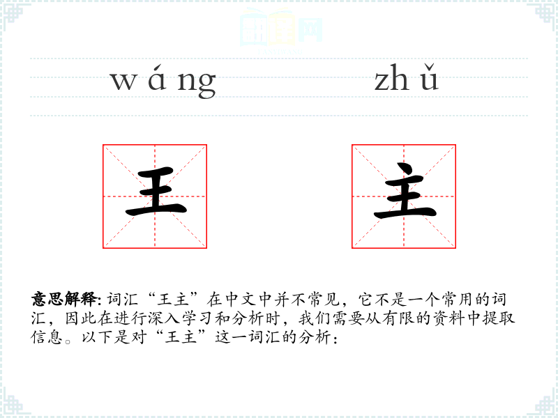 由于“王主”不是一个常用词汇,它在现代汉语中的使用非常有限。在古代文献或历史研究中,可能会出现“王主”一词,用以指代某个朝代的君主或统治者。