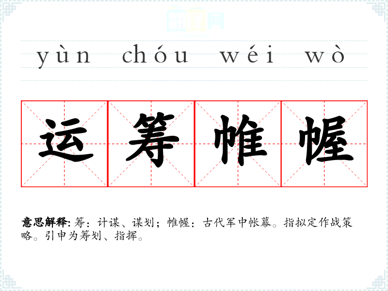 筹:计谋、谋划;帷幄:古代军中帐幕。指拟定作战策略。引申为筹划、指挥。