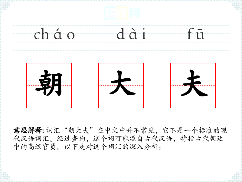 词汇“朝大夫”在中文中并不常见,它不是一个标准的现代汉语词汇。经过查询,这个词可能源自古代汉语,特指古代朝廷中的高级官员。以下是对这个词汇的深入分析: