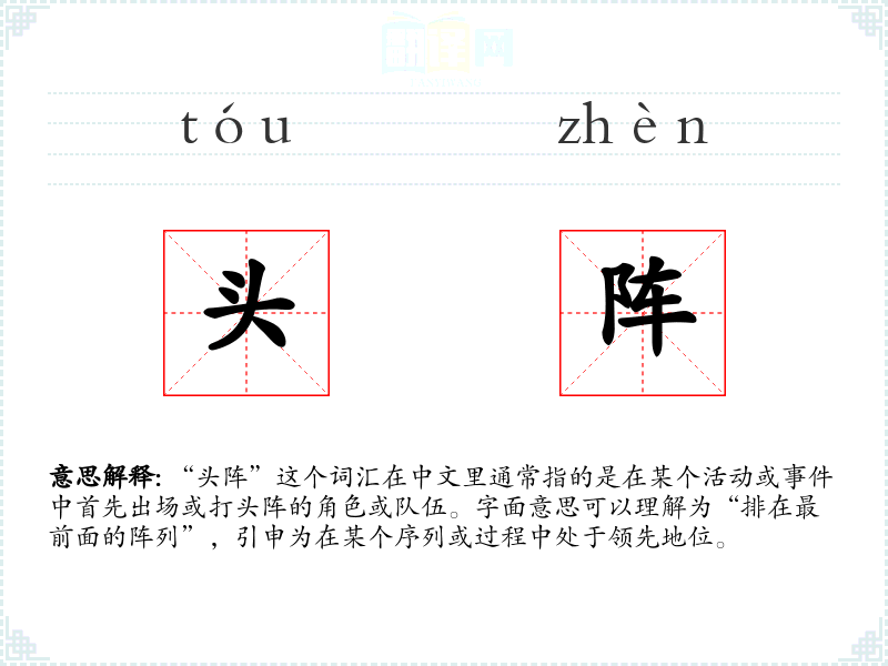 在英语中,“头阵”可以对应为“vanguard”或“frontline”,它们在含义上相似,都指在某个序列或过程中处于领先地位的人或事物。
