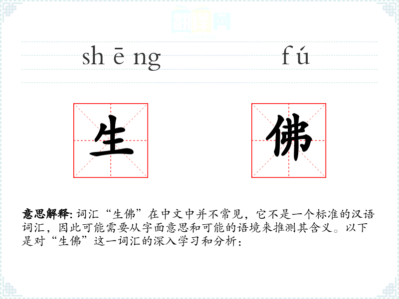 词汇“生佛”在中文中并不常见,它不是一个标准的汉语词汇,因此可能需要从字面意思和可能的语境来推测其含义。以下是对“生佛”这一词汇的深入学*和分析: