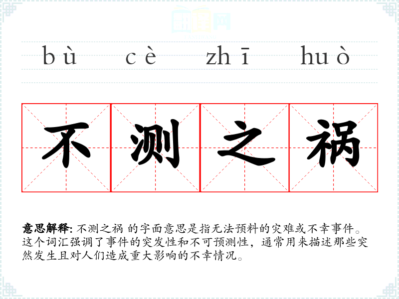 不测之祸 这个词汇源自汉语,其中“不测”意味着无法预测,“之祸”则是指灾难或不幸。这个词汇在古代文献中已有使用,随着时间的推移,其含义和用法基本保持稳定。