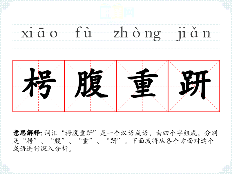 词汇“枵腹重趼”是一个汉语成语,由四个字组成,分别是“枵”、“腹”、“重”、“趼”。下面我将从各个方面对这个成语进行深入分析。