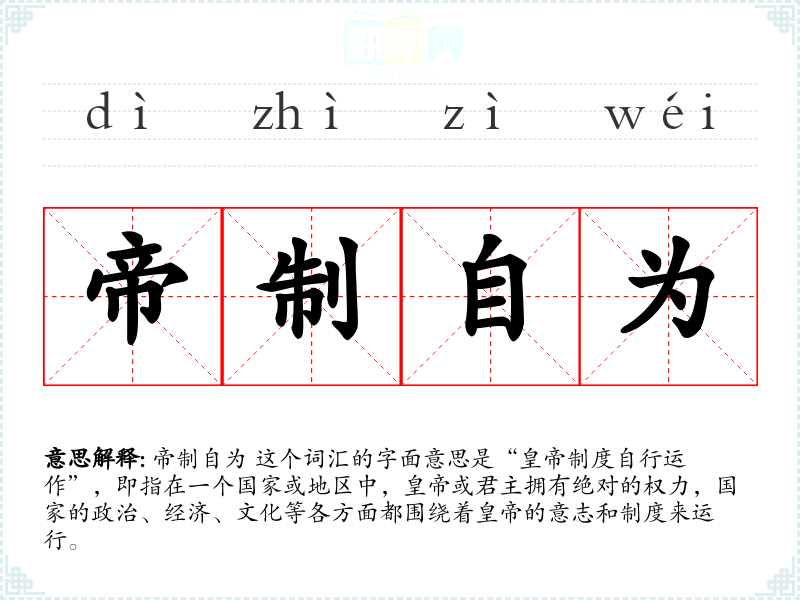 帝制自为 这个词汇的字面意思是“制度自行运作”,即指在一个国家或地区中,或君主拥有绝对的权力,国家的政治、经济、文化等各方面都围绕着**的意志和制度来运行。