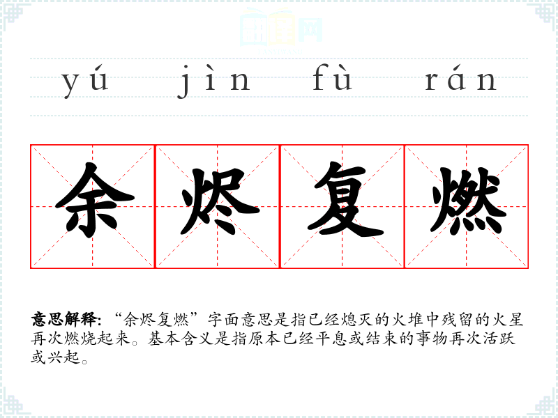 “余烬复燃”字面意思是指已经熄灭的火堆中残留的火星再次燃烧起来。基本含义是指原本已经平息或结束的事物再次活跃或兴起。