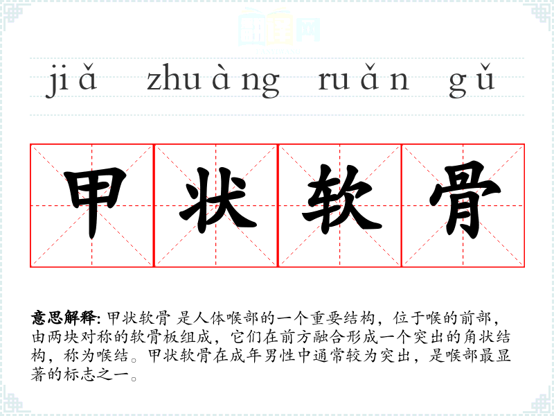 甲状软骨的名称来源于其形状(甲状)和材料(软骨)。在拉丁语中,“cartilago thyroidea”直接翻译为甲状软骨。这个术语在医学领域中一直保持其原始含义和用法。