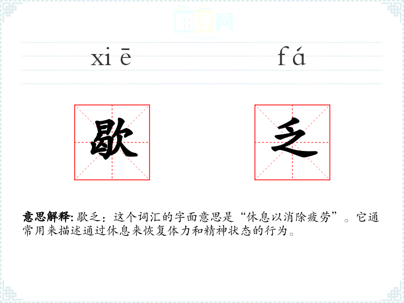 歇乏:这个词汇的字面意思是“休息以消除疲劳”。它通常用来描述通过休息来恢复体力和精神状态的行为。