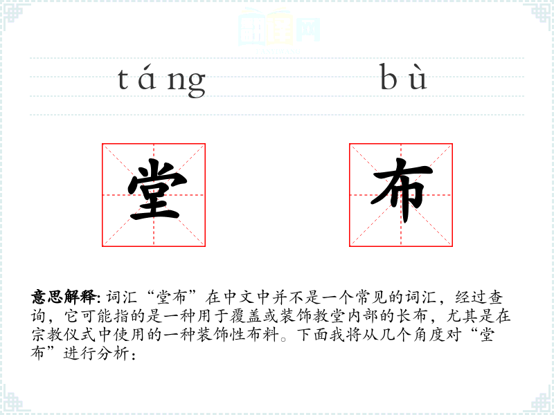 词汇“堂布”在中文中并不是一个常见的词汇,经过查询,它可能指的是一种用于覆盖或装饰教堂内部的长布,尤其是在**仪式中使用的一种装饰性布料。下面我将从几个角度对“堂布”进行分析: