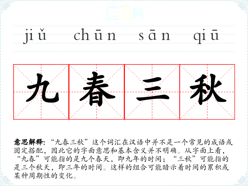 由于“九春三秋”不是一个常用词汇,它的词源和历史演变并不明确。可能是某个特定文学作品或历史文献中的创造性用法,后来没有被广泛接受或流传。