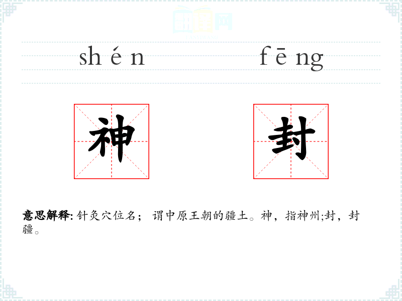 针灸穴位名; 谓中原王朝的疆土。神,指神州;封,封疆。