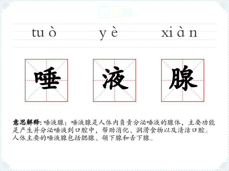 - 词源:唾液腺一词源自拉丁语“glandula”(小腺体)和“saliva”(唾液)。