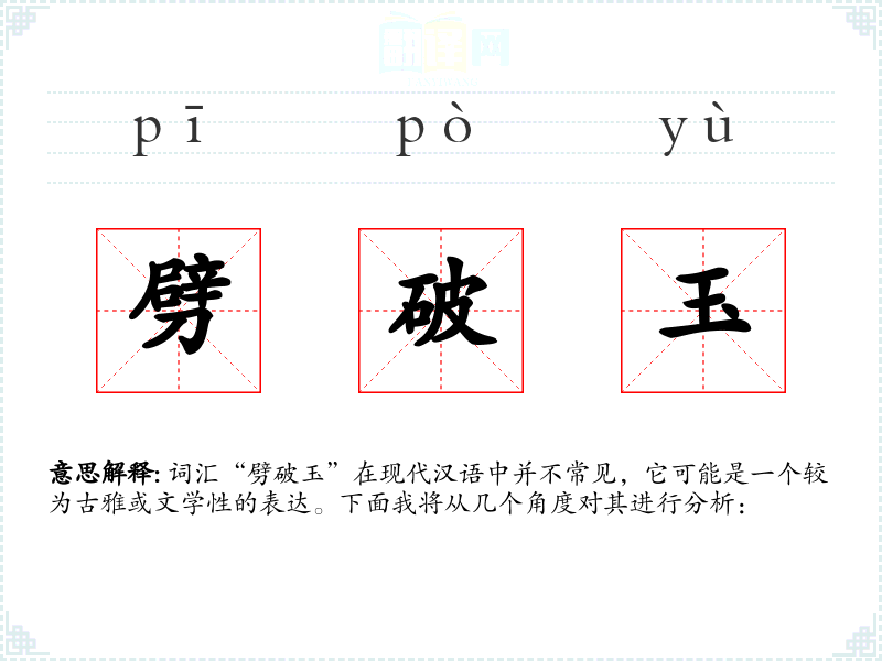 词汇“劈破玉”在现代汉语中并不常见,它可能是一个较为古雅或文学性的表达。下面我将从几个角度对其进行分析: