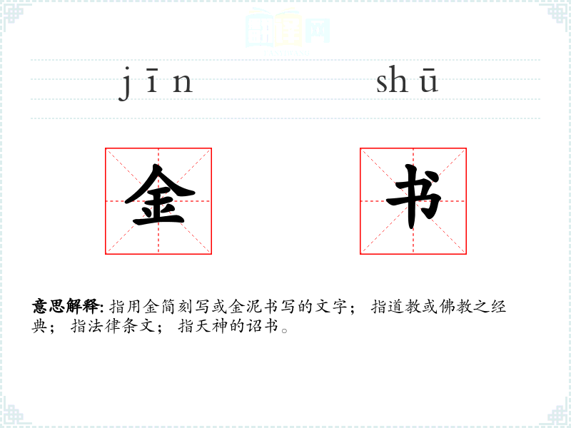 指用金简刻写或金泥书写的文字; 指道教或佛教之经典; 指法律条文; 指天神的诏书。