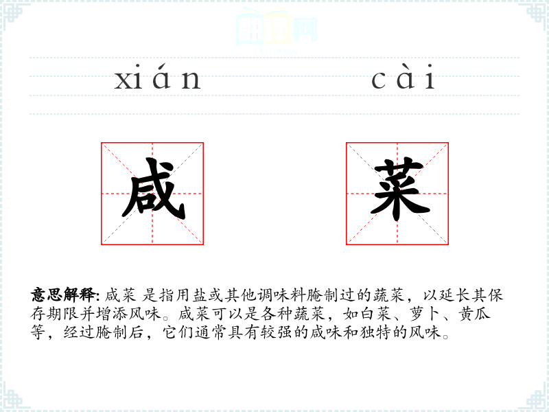 - 反义词:新鲜蔬菜(咸菜通常指的是经过腌制处理的蔬菜,而新鲜蔬菜则是指未经过处理的蔬菜)