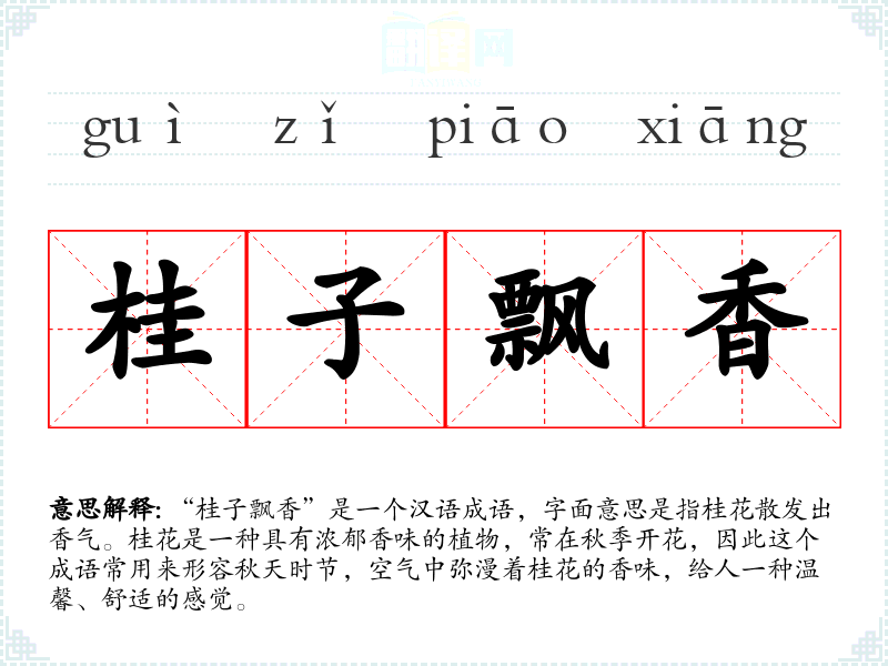 - 文学语境:在文学作品中,“桂子飘香”常用来描绘秋天的景色,营造一种宁静、美好的氛围。例如,古诗中常用此成语来表达对秋天的喜爱和对自然美景的赞美。