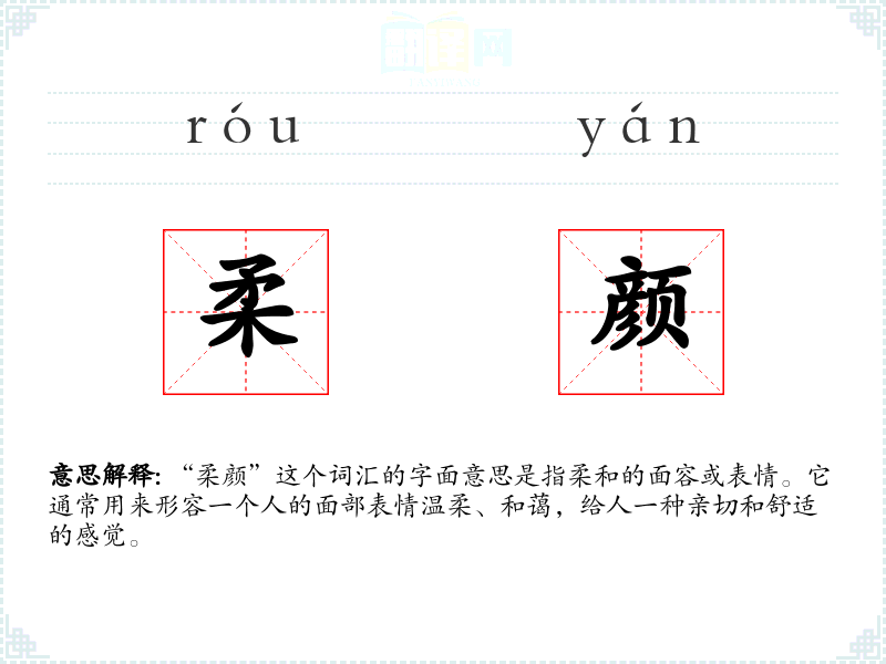 “柔颜”由“柔”和“颜”两个字组成。“柔”字古汉语中意为柔软、温和,“颜”字则指面容。这个词汇在古代文学中已有使用,随着时间的推移,其含义和用法基本保持稳定。