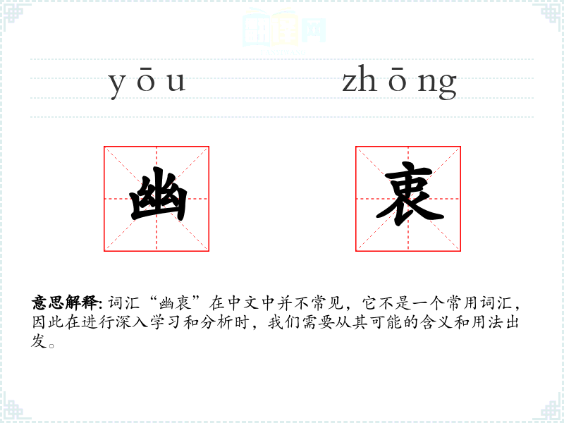 由于“幽衷”不是一个常用词汇,它在文学作品中可能被用来形容人物的内心世界,特别是在描述那些情感复杂、内心深沉的角色时。在口语和专业领域中,这个词汇可能不太常用。