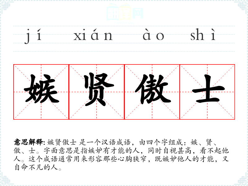 嫉贤傲士 是一个汉语成语,由四个字组成:嫉、贤、傲、士。字面意思是指嫉妒有才能的人,同时自视甚高,看不起他人。这个成语通常用来形容那些心胸狭窄,既嫉妒他人的才能,又自命不凡的人。