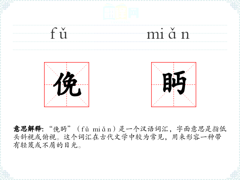 “俛眄”(fǔ miǎn)是一个汉语词汇,字面意思是指低头斜视或俯视。这个词汇在古代文学中较为常见,用来形容一种带有轻蔑或不屑的目光。