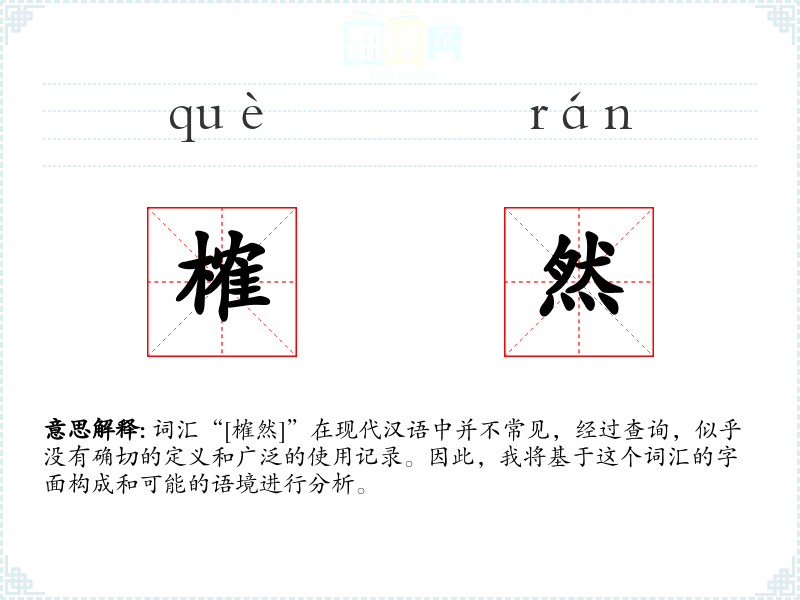 词汇“[榷然]”在现代汉语中并不常见,经过查询,似乎没有确切的定义和广泛的使用记录。因此,我将基于这个词汇的字面构成和可能的语境进行分析。