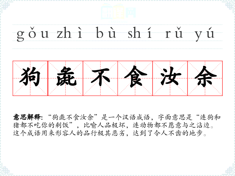 “狗彘不食汝余”是一个汉语成语,字面意思是“连狗和猪都不吃你的剩饭”,比喻人品极坏,连动物都不愿意与之沾边。这个成语用来形容人的品行极其恶劣,达到了令人不齿的地步。