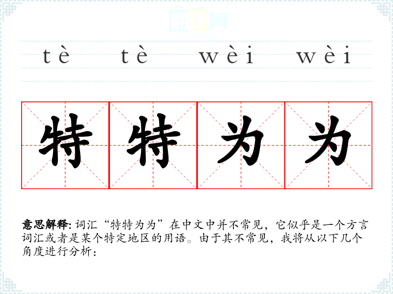 词汇“特特为为”在中文中并不常见,它似乎是一个方言词汇或者是某个特定地区的用语。由于其不常见,我将从以下几个角度进行分析: